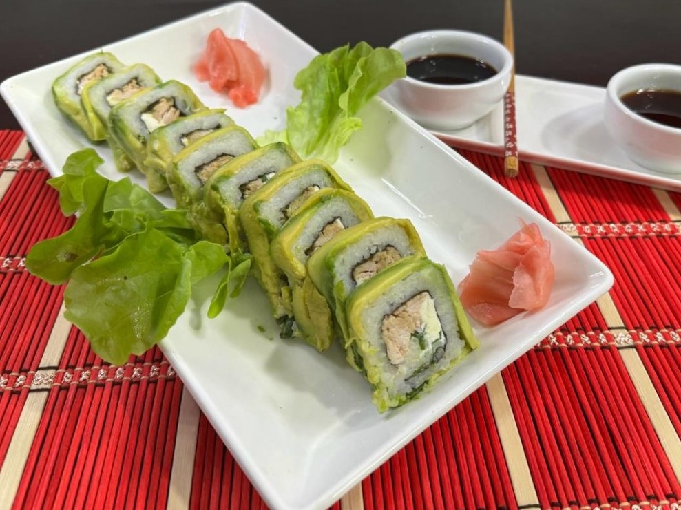 Relleno con pollo teriyaki, cebollín y queso crema. Envuelto en palta.