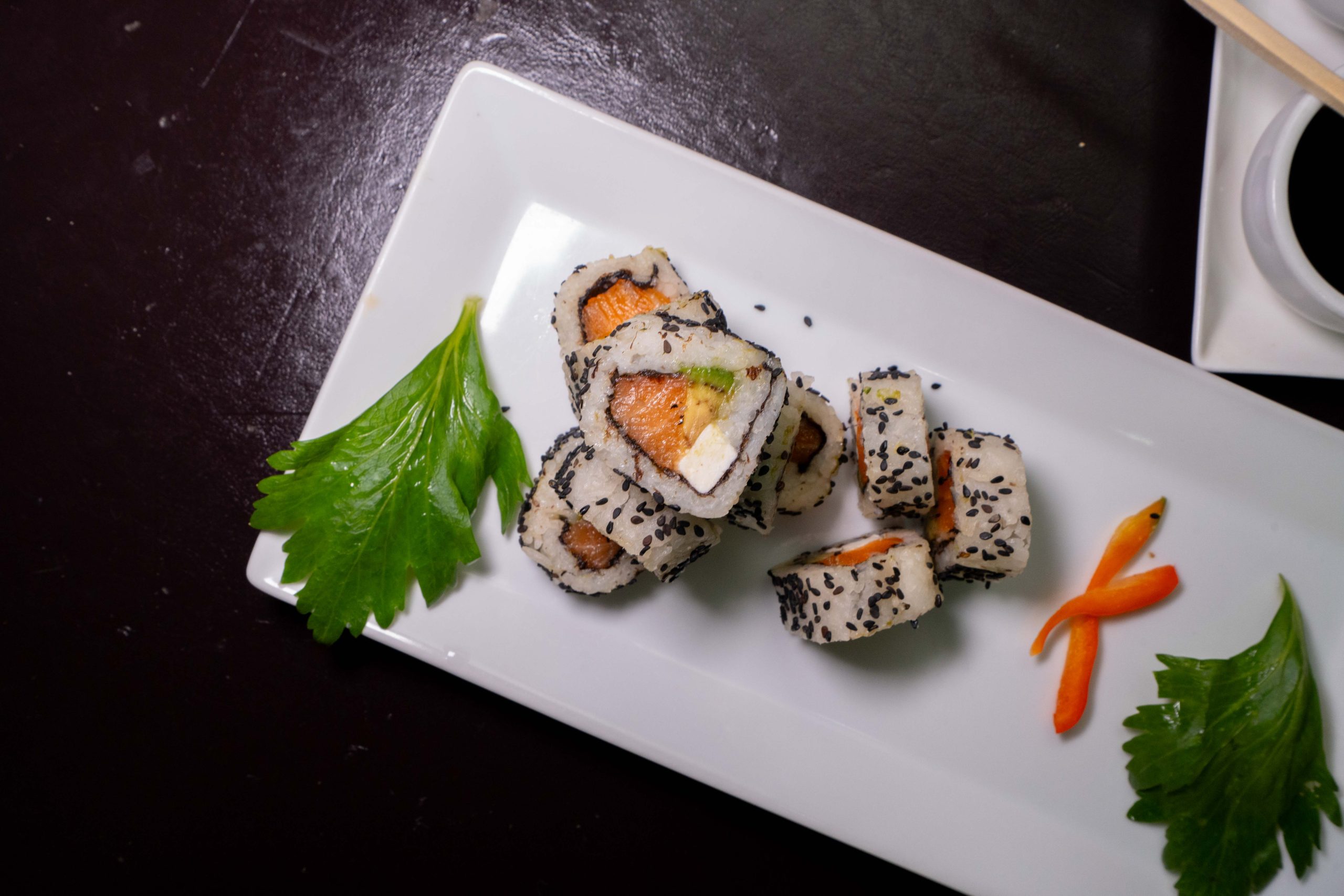 Relleno con salmón, palta y queso crema. Envuelto en sésamo negro.