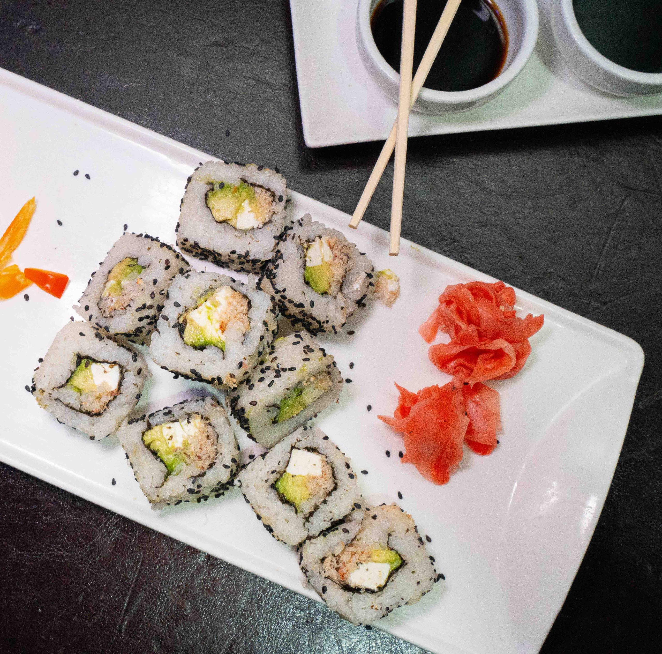 Relleno con pollo teriyaki, palta y queso crema. Envuelto en sésamo negro.