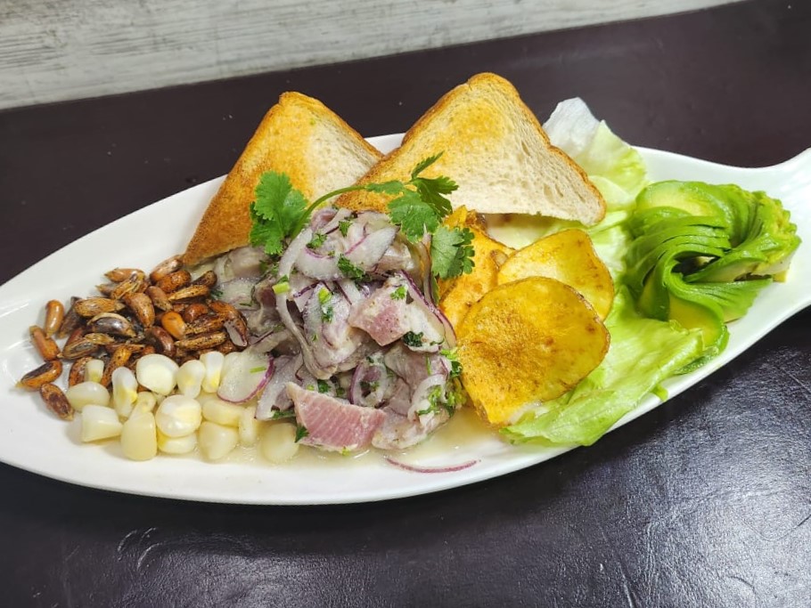 reineta. marinado en leche de tigre oriental. Acompañado de choclo peruano, canchita, palta y chips de camote.