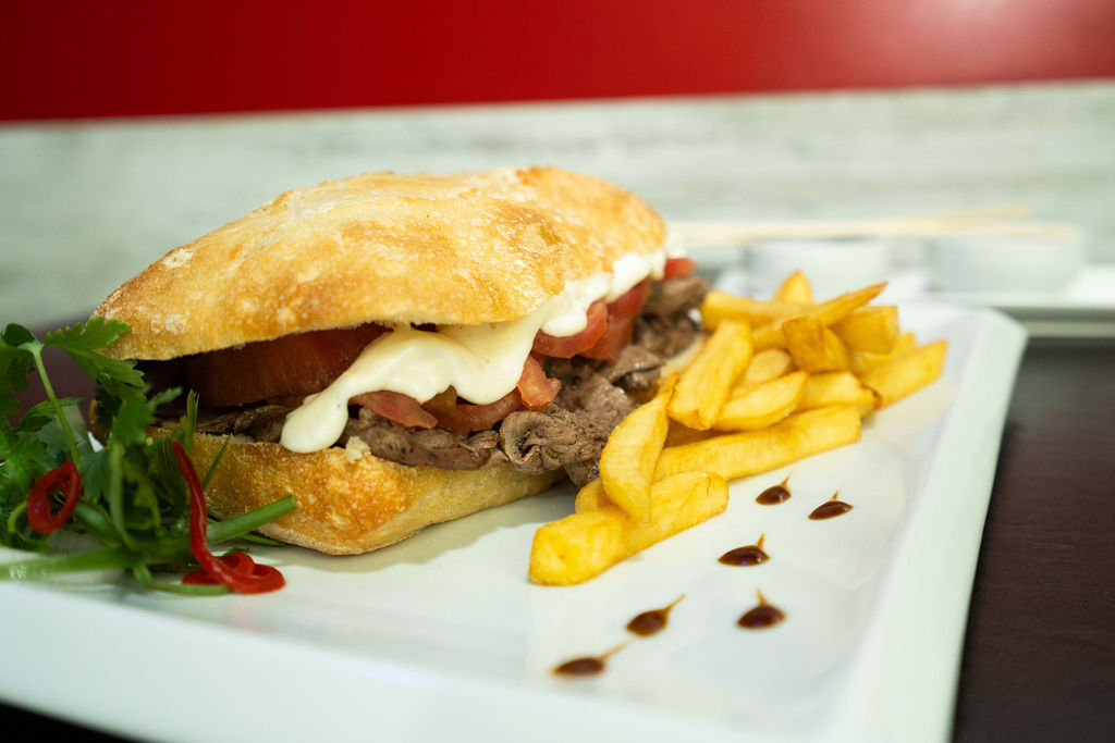 Carne laminada a la plancha, con tomate y mayo. Con papas fritas.