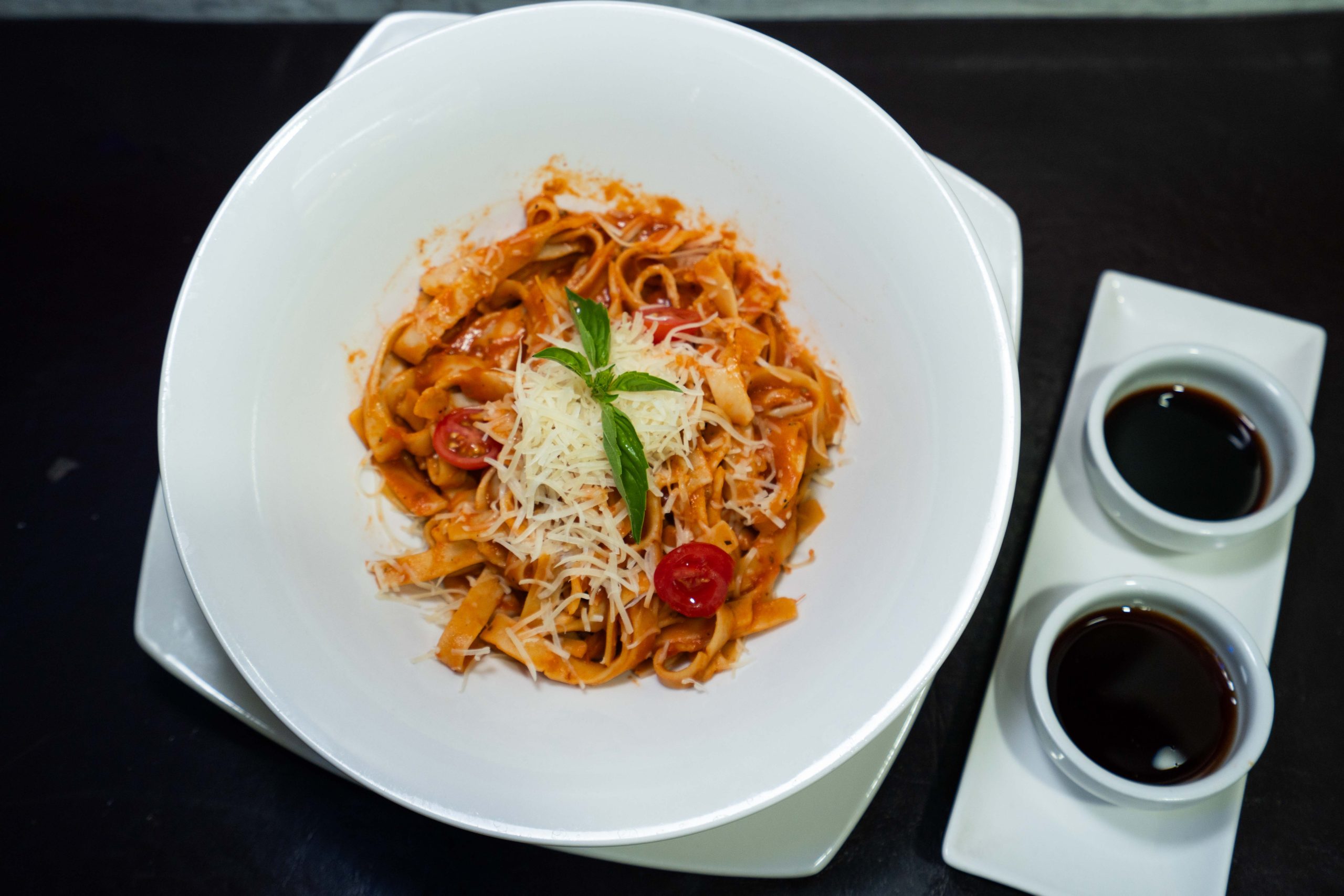 Fetuccini en salsa bolognesa, elaborada con carne molida y salsa pomodoro. Servida con queso parmesano.