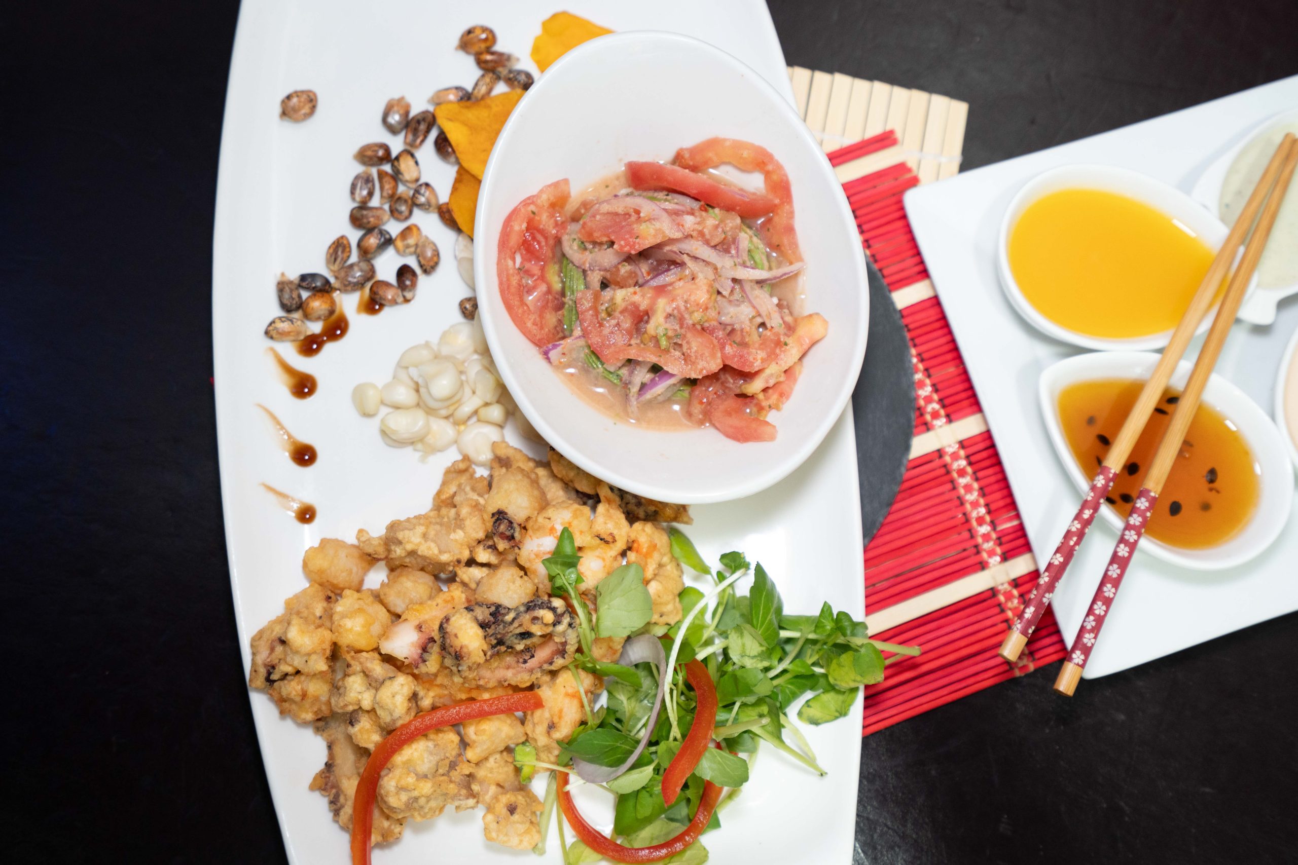 Porción de calamar, ostión, camarón, pulpo y reineta frita. Con chips de camote, canchita y choclo peruano.