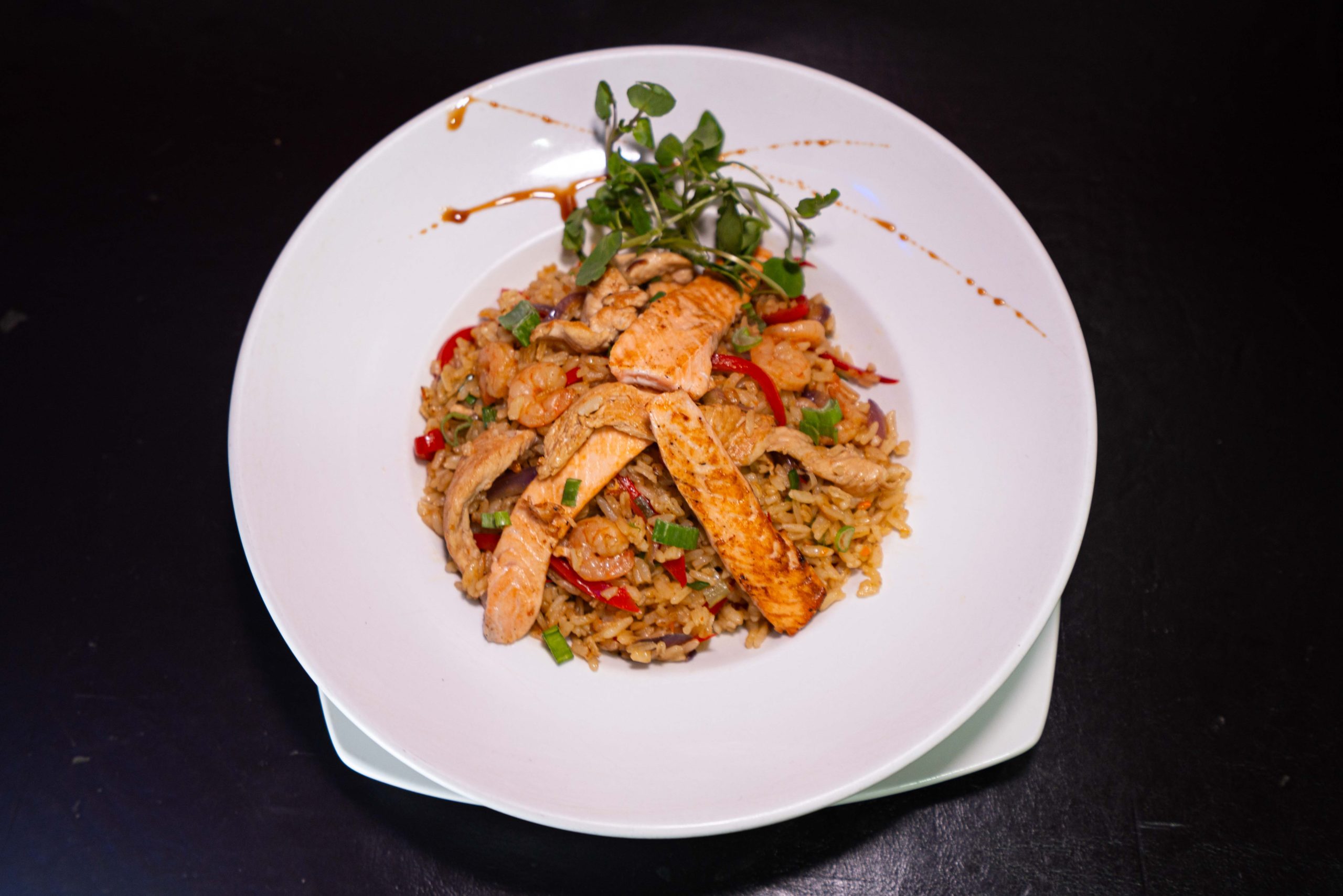 Salmón y pollo en tiras, camarón nacional, morrón, cebolla morada y arroz. Salteado con soja, aceite de sésamo y flameado en vino blanco.