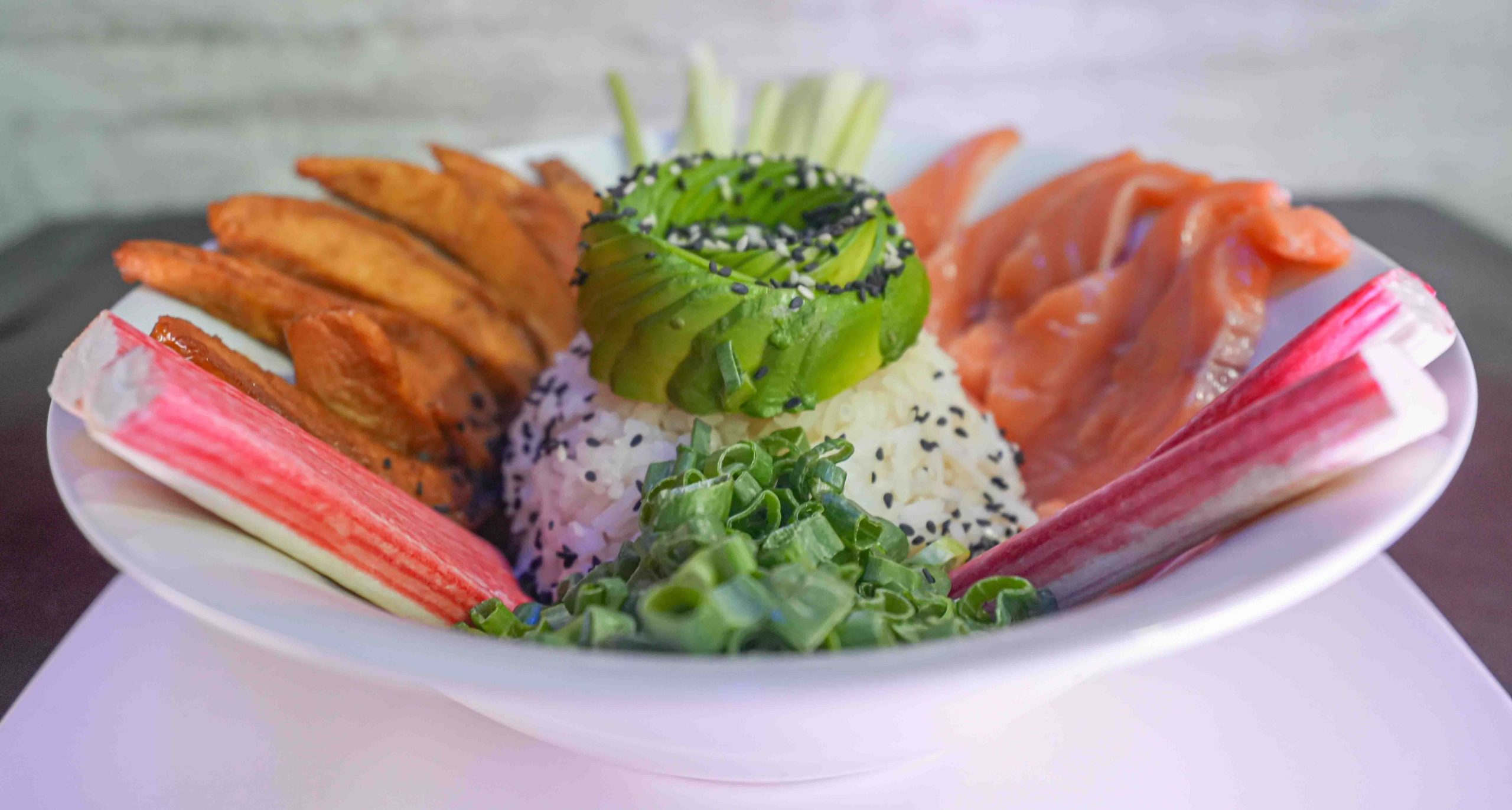 Base de arroz, con palta, cebollín, kanikama, pollo y queso crema. Acompañado de salmón.