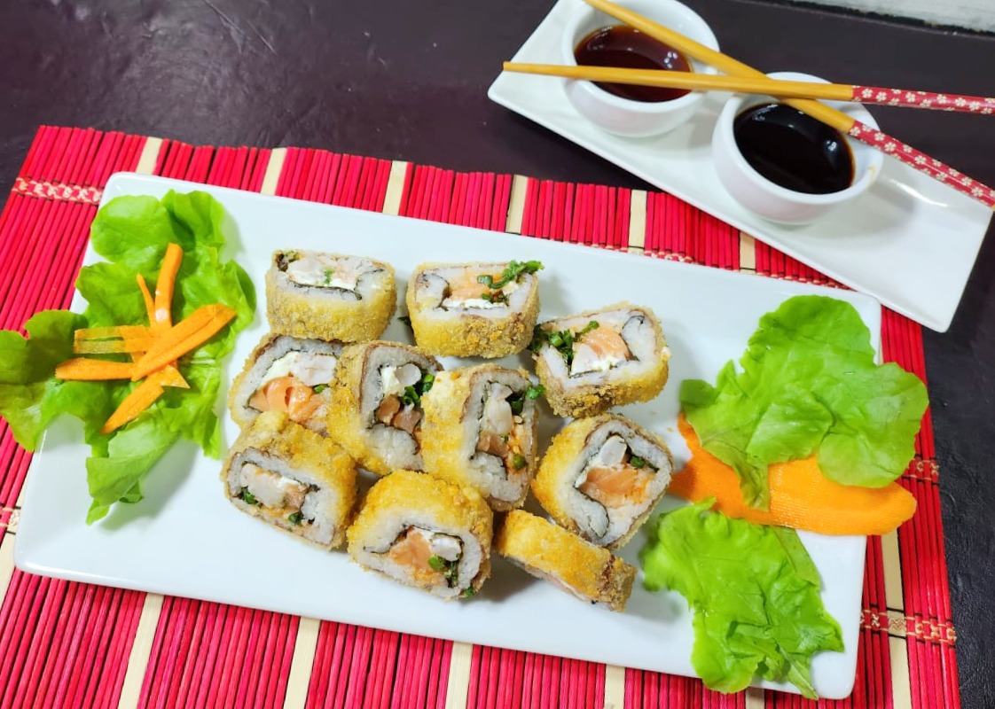 Roll relleno con camarón, salmón, queso crema, cebollín y salsa sriracha. Envuelto en carne apanada