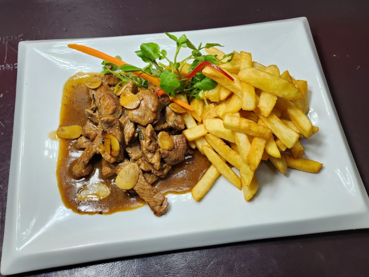 Lomo salteado en ajos laminados, con soya, mantequilla, flameado en vino blanco, con papas fritas.