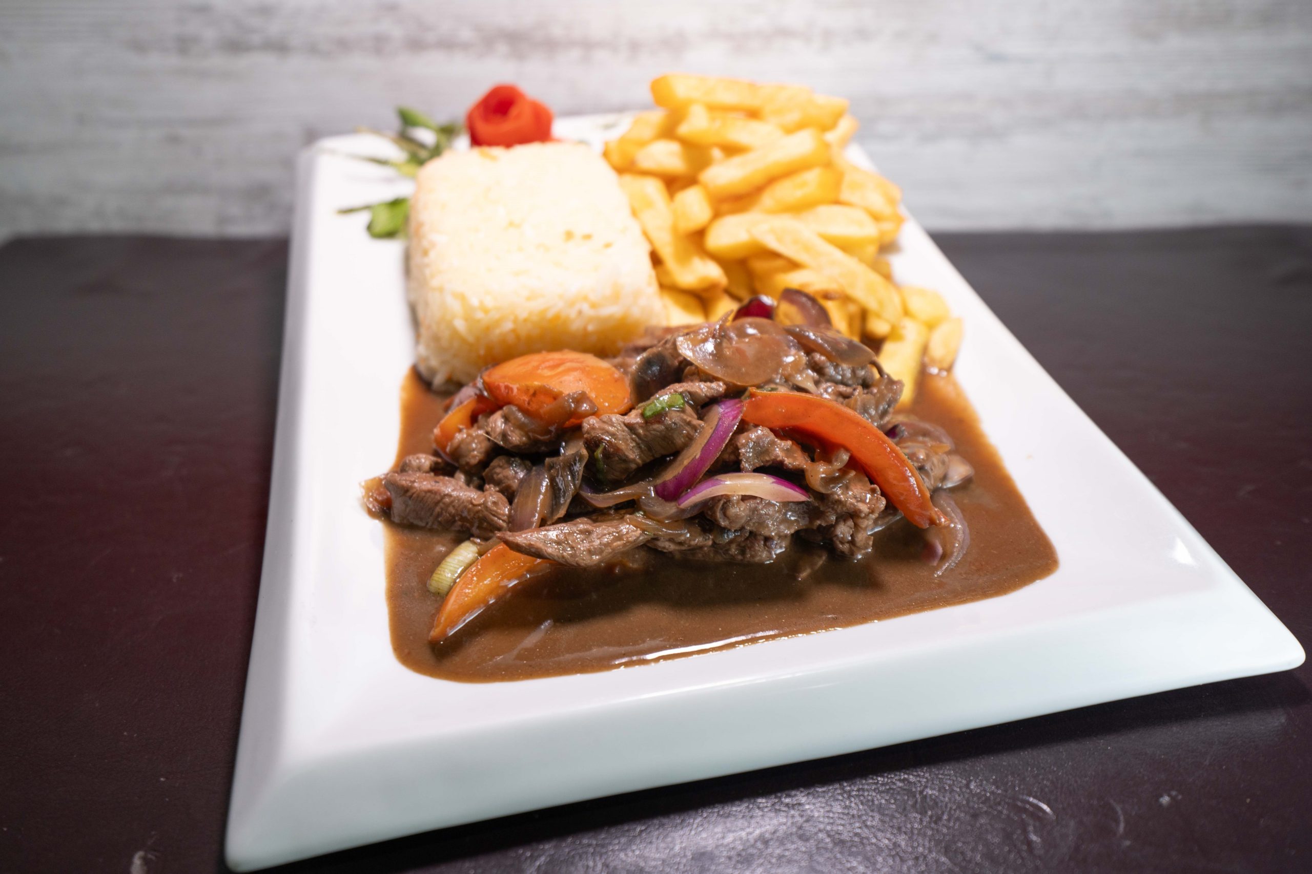 Carne salteada con cebolla, tomate, cebollín y soya. Flameado en vino blanco, con arroz y papas fritas.