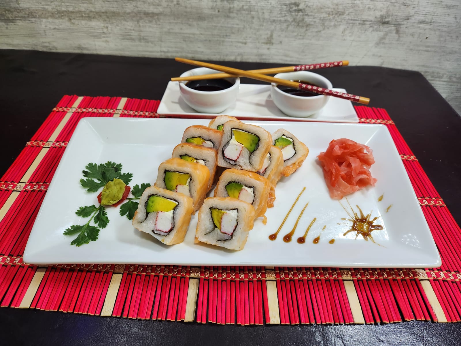 Relleno con kanikama, palta, queso crema. Envuelto en salmón.