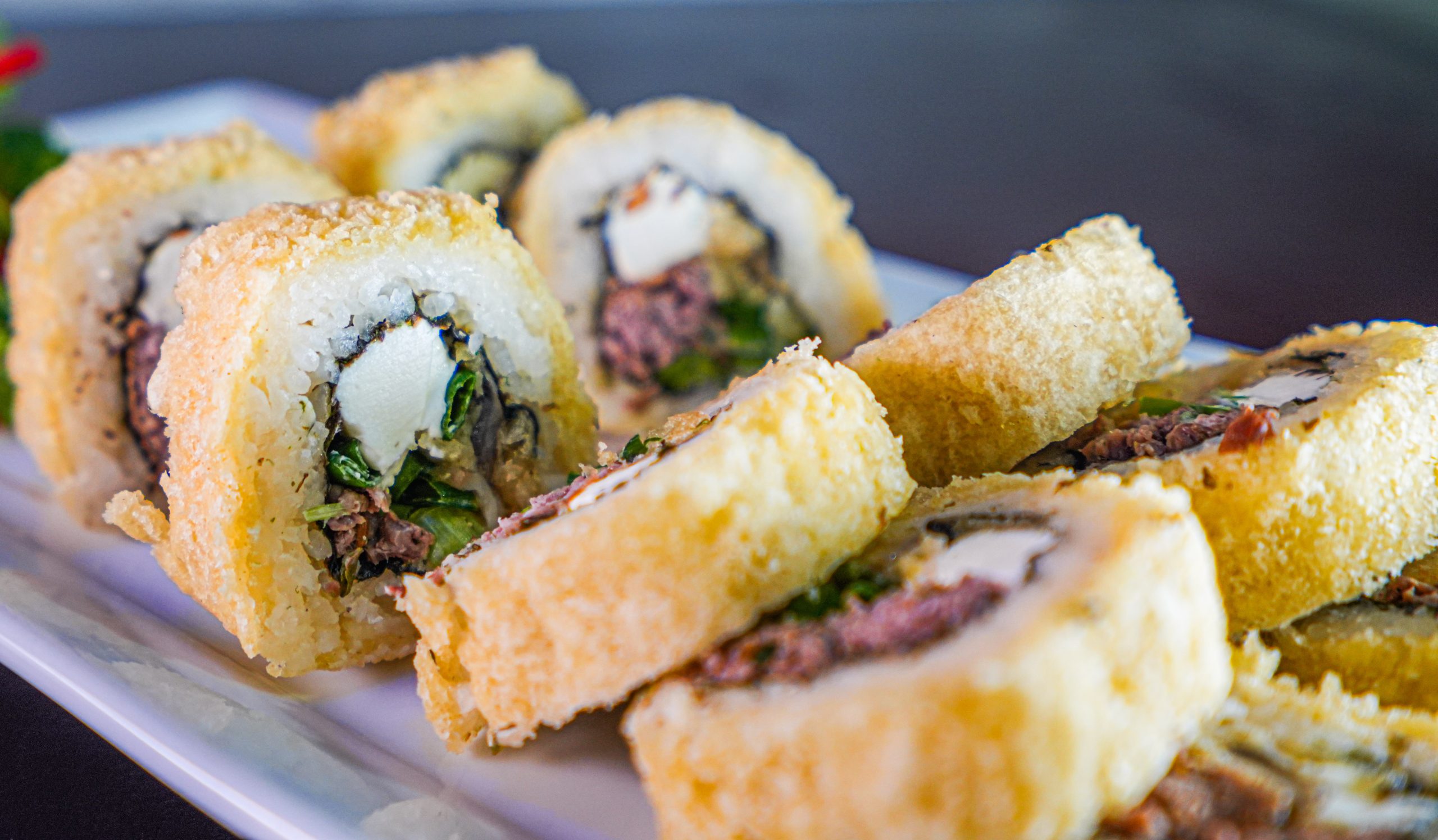 Relleno con alga nori, carne mechada, champiñones tempurizados, queso crema y cebollín.