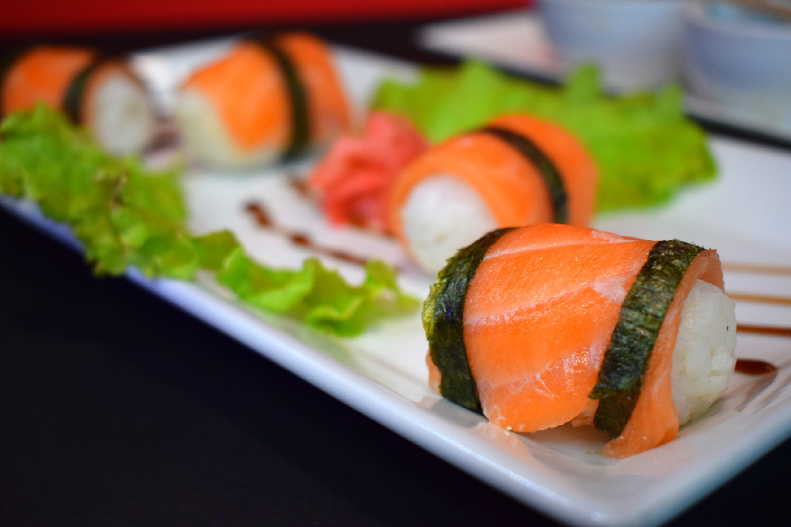 4 unidades a base de arroz, acompañadas de salmón y una cinta de alga nori.