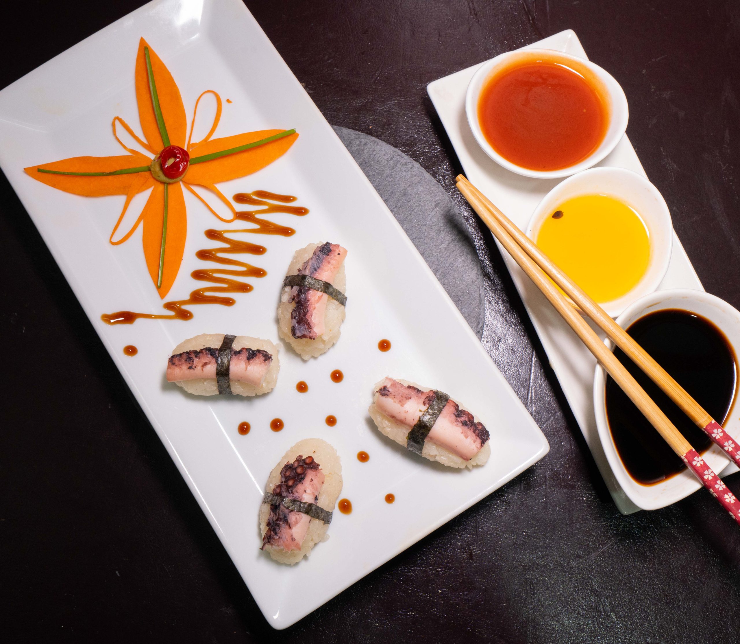 4 unidades elaboradas a base de arroz, acompañadas con pulpo y una cinta de alga nori