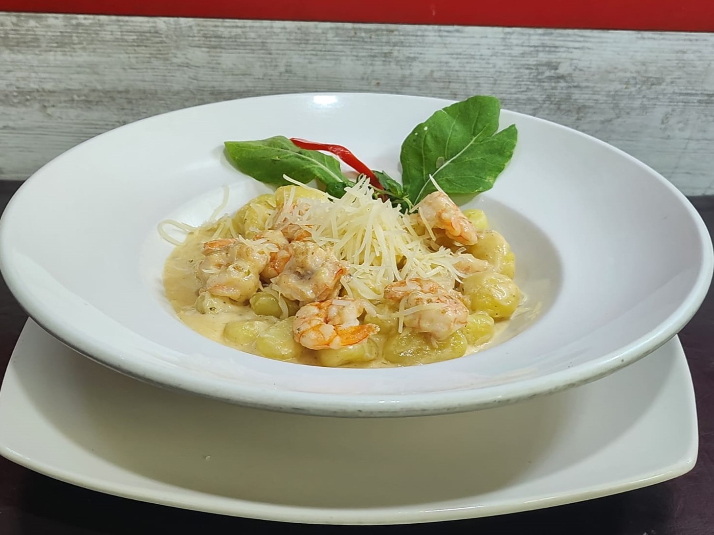 Masa a base de papa salteado con camarón ecuatoriano, flameado con vino blanco y crema de leche. Servido con salsa de camarón y queso parmesano.
