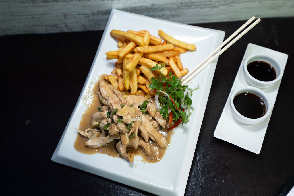 400g de filetitos de pollo adobado en vino blanco y ajo laminado, con papas fritas.