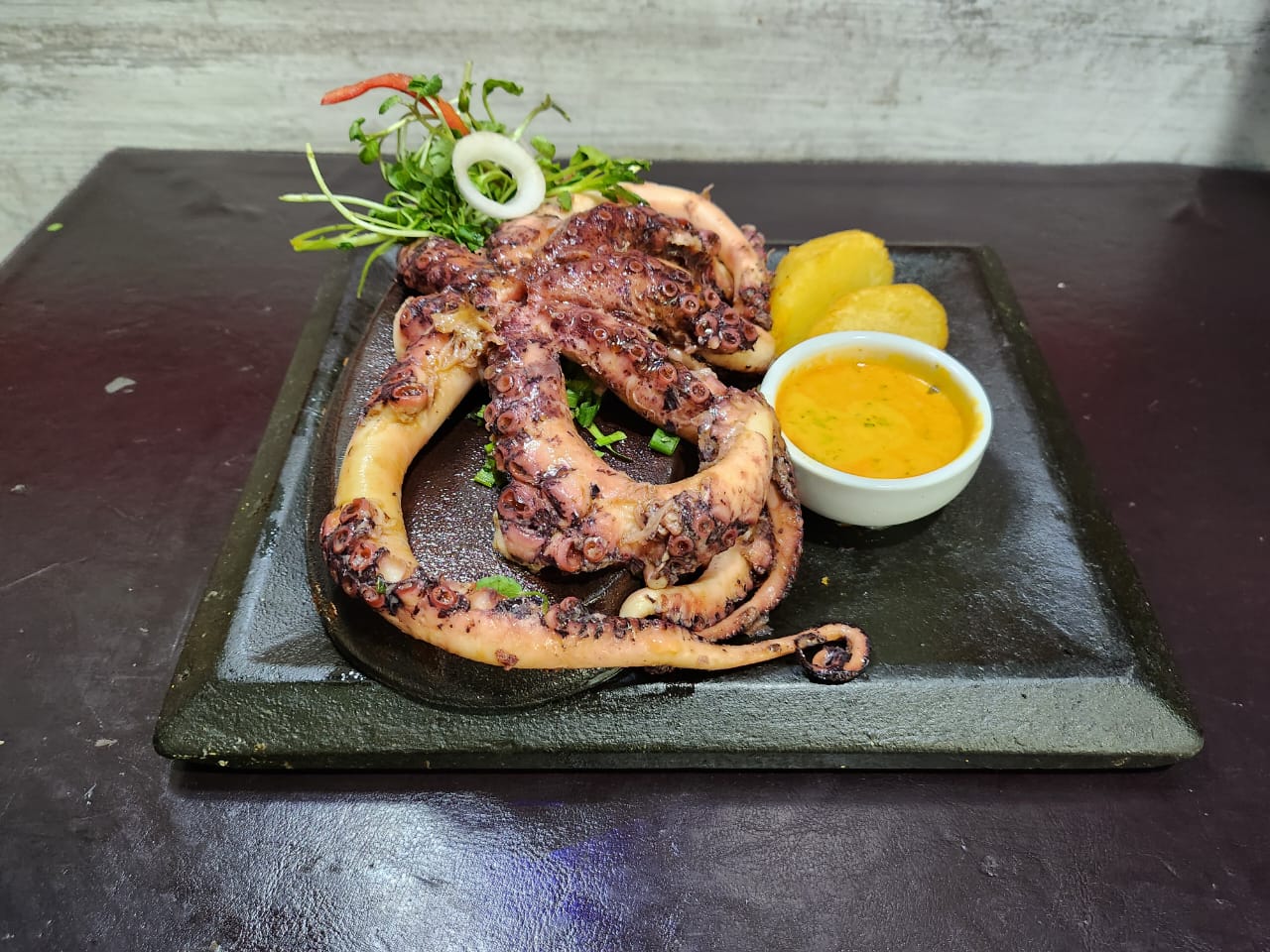 300 gramos de pulpo fresco servido a la piedra, aliñado y flameado con vino blanco. Con salsa de ají y papas doradas.