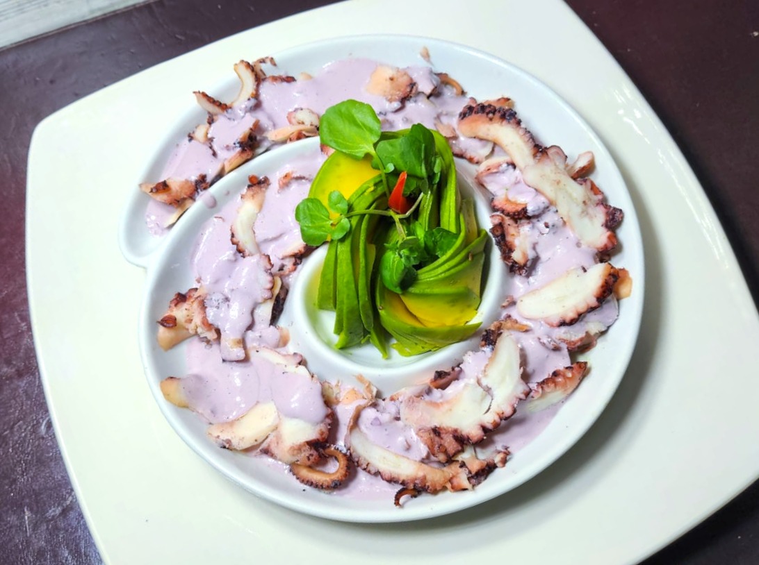 Pulpo fresco laminado, bañado en salsa al olivo. Acompañado de palta.