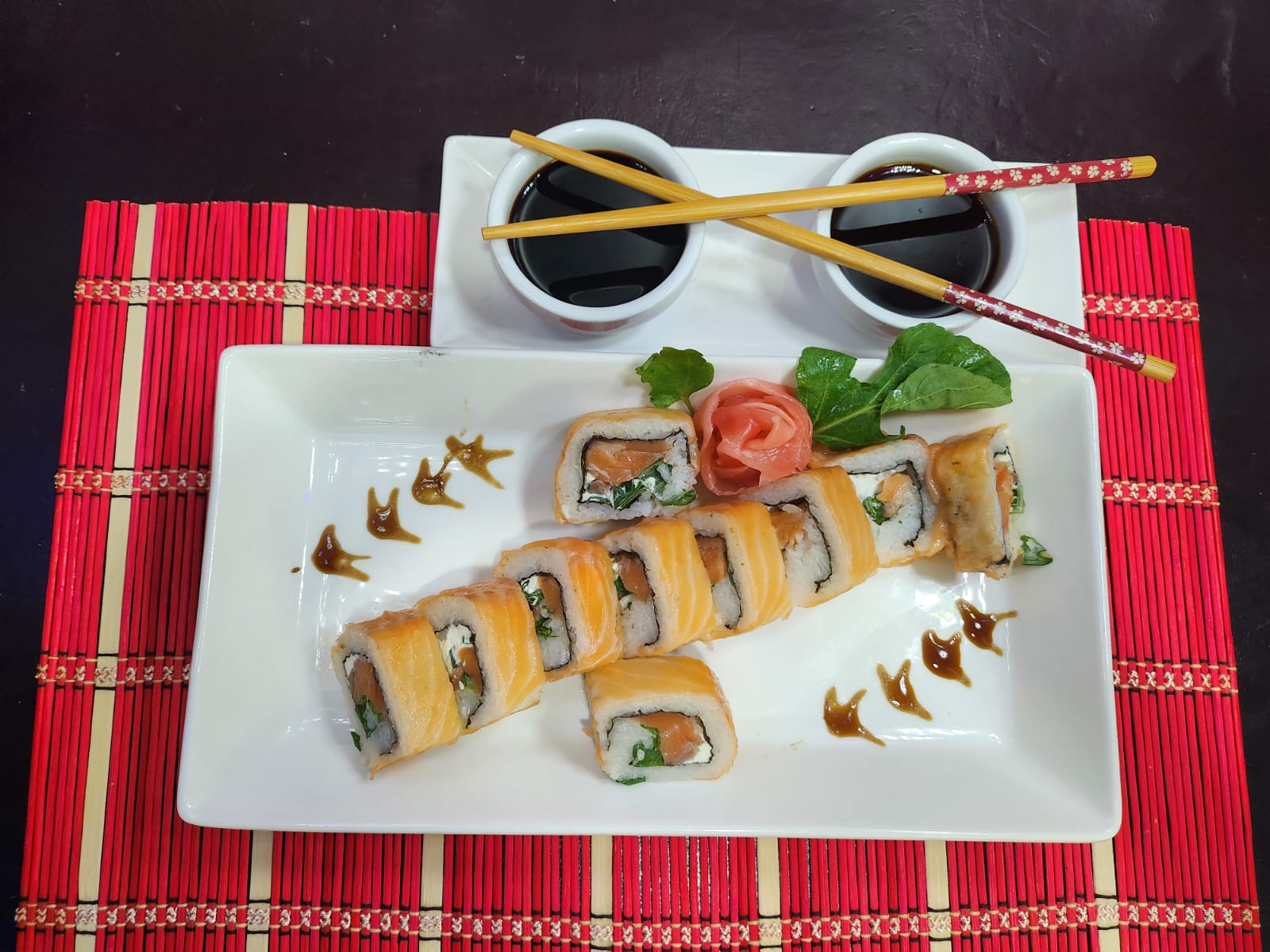 Relleno con salmón, queso crema, cebollín. Envuelto en salmón.