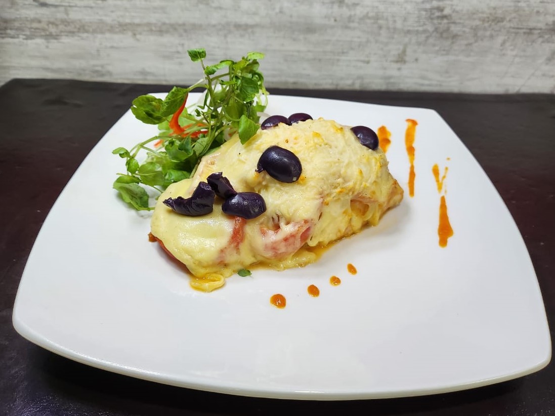 Salmón del sur a la plancha, gratinada con tomate, salsa modoro y queso parmesano.