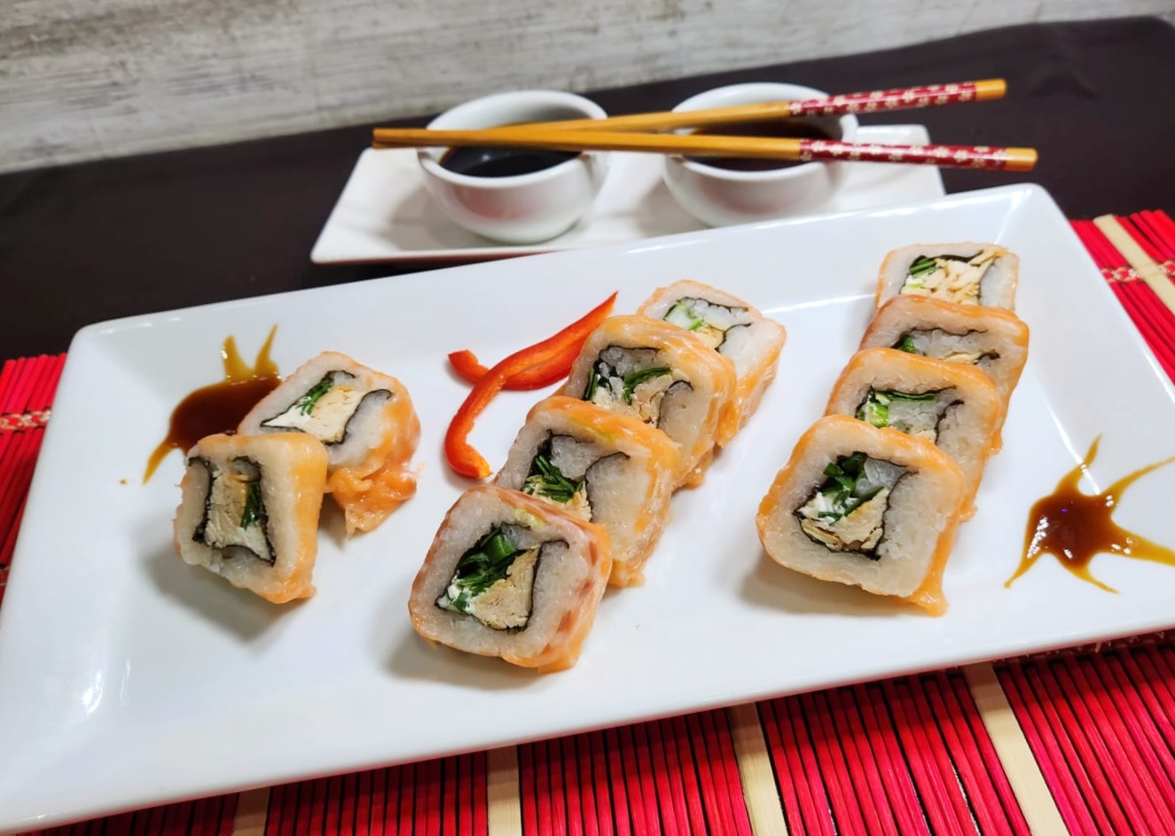 Relleno con pollo teriyaki, queso crema y cebollín. Envuelto en jamón serrano.