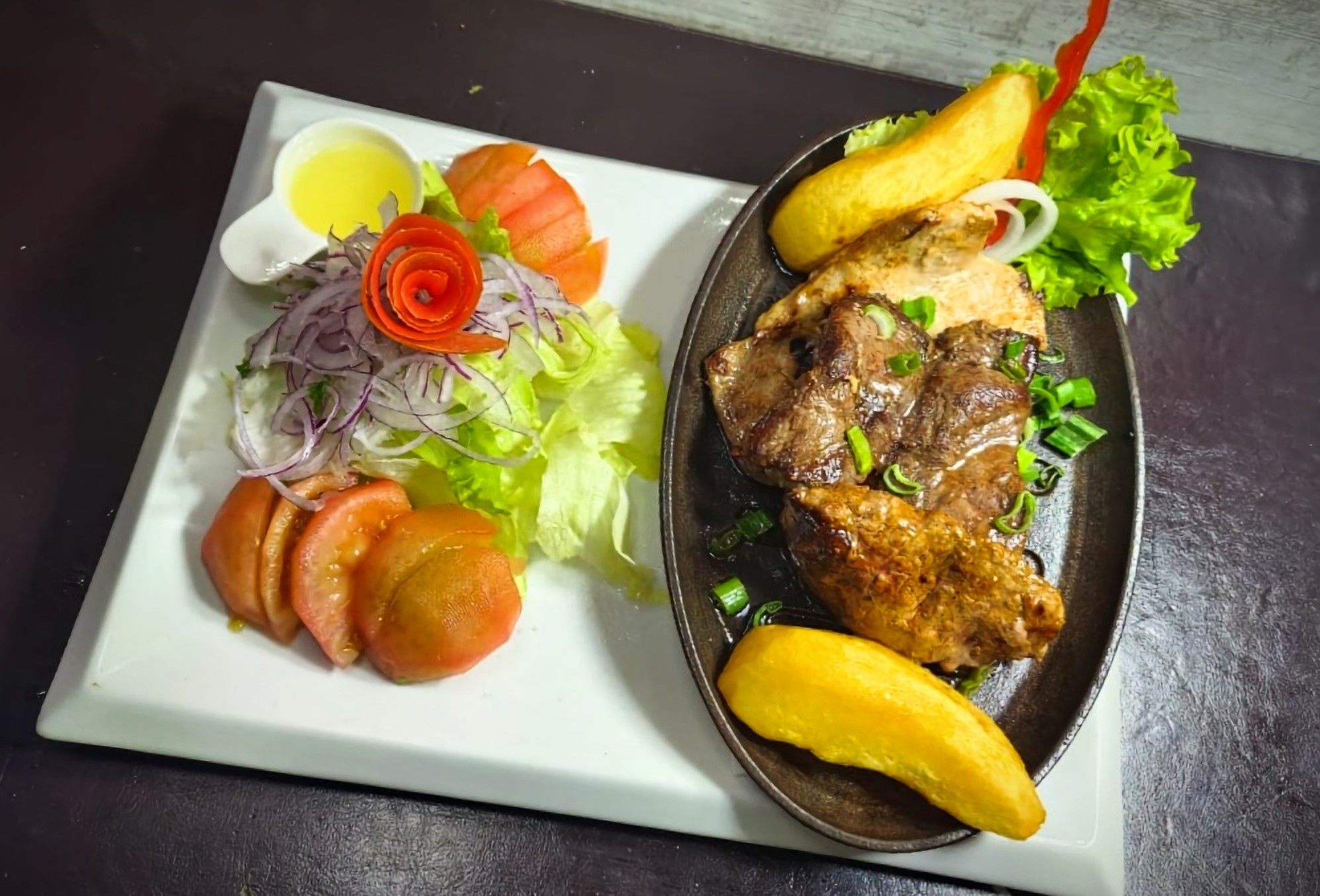 150g lomo liso, 150g cerdo, costilla de cordero, ensalada, papas doradas.