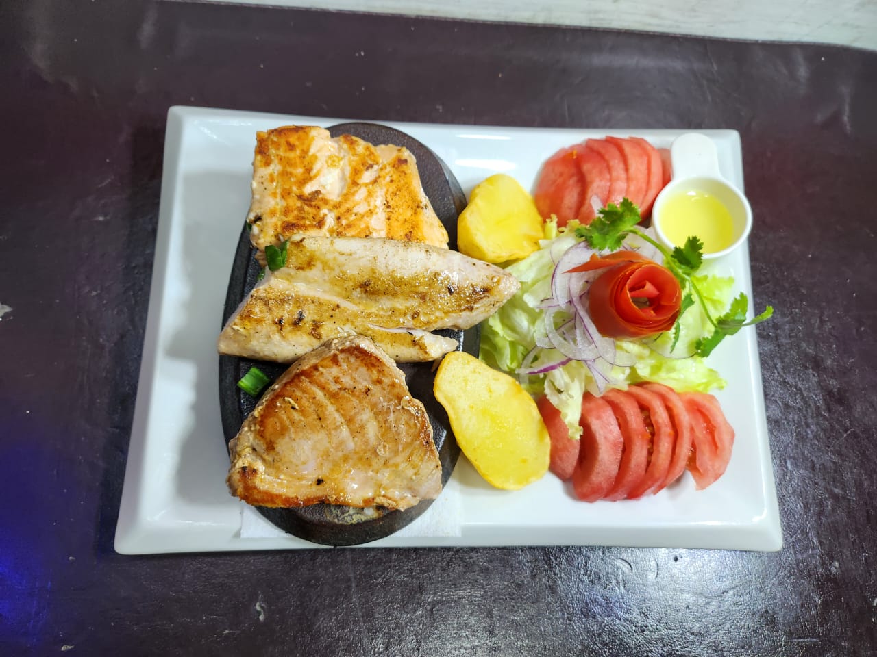 Salmón del sur, reineta y atún a la plancha. Con papas doradas y ensalada.